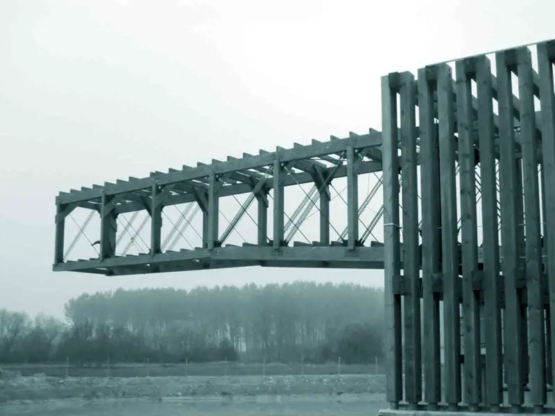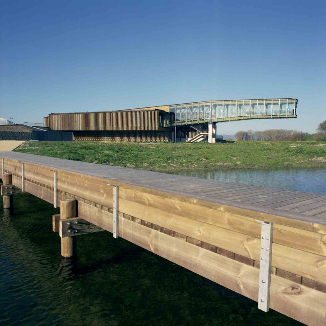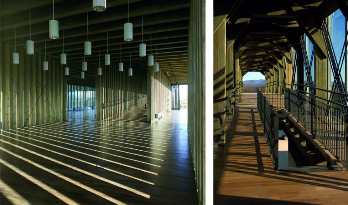 La apuesta de partida es la de emplear solamente madera una vez producido el corte entre terreno (base de hormigón que levanta la madera del suelo para evitar su contacto con la humedad) y pórticos; ello lleva a combinar la madera laminada con tableros de OSB (de fibras orientadas) y de Kerto (microlaminado con una capacidad de resistencia similar a la del acero); la presencia del acero se reduce a los pernios y placas de apoyo, evitando en todo momento que los encuentros entre piezas de madera se produzcan con prótesis (solución «fácil» que desvirtúa visual y conceptualmente el empleo de madera en estructuras), sino con meros pasadores o similares.