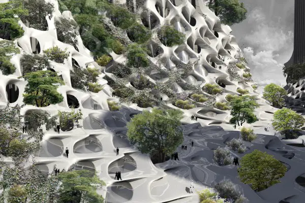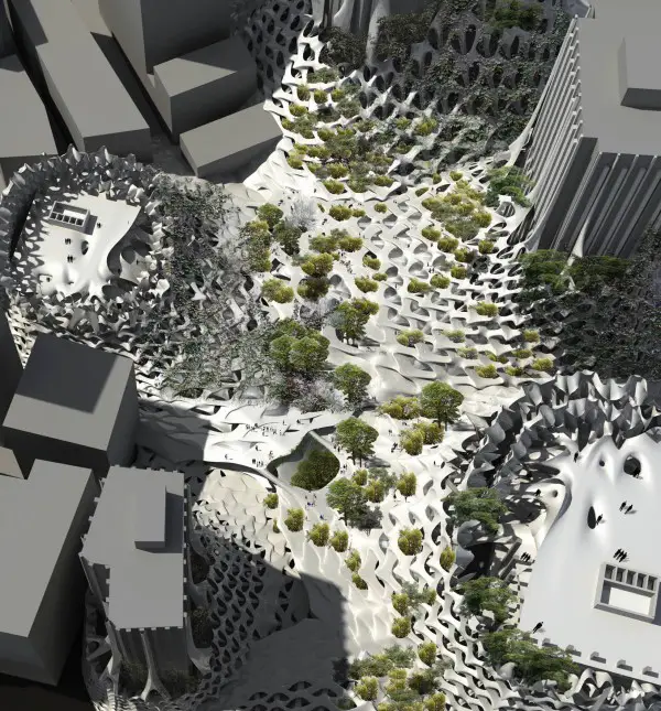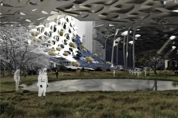 Para enfrentar el problema del aumento del nivel del mar en Nueva York, los arquitectos Tingwei Xu y Xie Zhang de la Universidad de Pennsylvania diseñaron esta idea para proteger ciertas áreas de la ciudad contra el agua mediante una “membrana”. Derivado de componentes inteligentes, se creo un sistema de superficies que puede revelar una expresión continuamente cambiante.